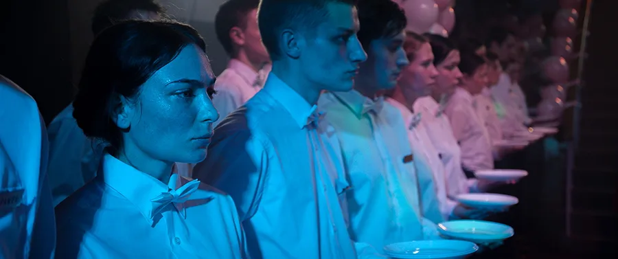 Poniżani przez despotyczną menedżerkę hotelu i przymuszani do wykonywania niezrozumiałych dla nich zadań studenci ulegają stopniowej odczłowieczeniu.