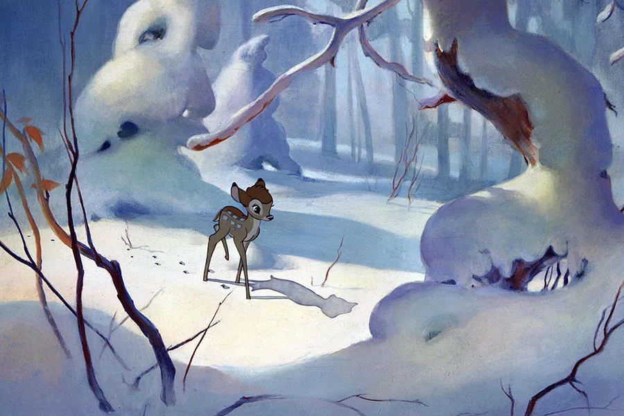 Jelonek Bambi beztrosko spędza każdy dzień. Pierwsze spotkanie z ludźmi kończy się śmiercią jego matki.