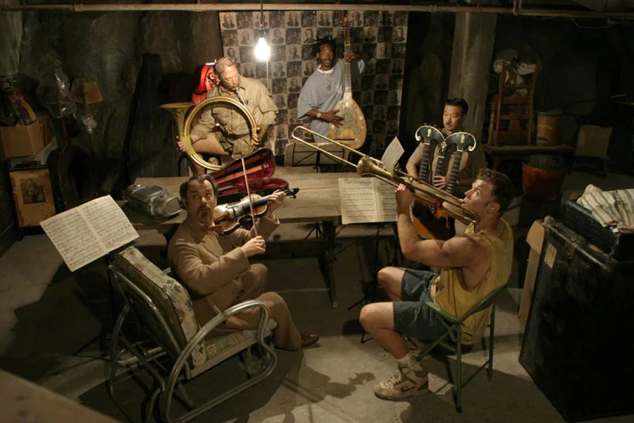 Pięciu nieudolnych złodziei, podających się za muzyków, odbywa próby w piwnicy domu starszej pani. Planują zrobić podkop do pobliskiego kasyna i je obrabować.